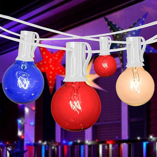 Shorts, tees, dresses, flag print swimsuits, and glow accessories.